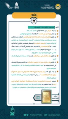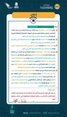 أعلنت وزارة الأوقاف والشؤون الدينية عبر صفحتها الرسمية على موقع التواصل الاجتماعي تويتر ،عن فتح باب التسجيل للحج عن طريق النظام الإلكتروني لحجاج سلطنة عمان ، وفقًا للشروط التالية: