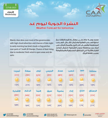 أعلنت هيئة الأرصاد الجوية عبر صفحتها الرسمية على موقع التواصل الاجتماعي تويتر عن حالة الطقس ليوم غد الأربعاء ، والطقس صحو بوجه عام على معظم المحافظات مع تدفق السحب العالية واحتمال تشكل السحب المنخفضة والضباب آخر الليل والصباح الباكر على أجزاء من محافظة جنوب الشرقية ،و احتمال تصاعد الغبار والأتربة في المناطق الصحراوية والمكشوفة بسبب نشاط الرياح.