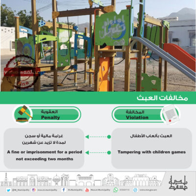 نوهت بلدية مسقط عبر صفحتها الرسمية على موقع التواصل الاجتماعي تويتر عن أن العبث بألعاب الأطفال مخالف للقوانين والأوامر المحلية لـ بلدية مسقط، ويعرض صاحبه الغرامة المالية والسجن لمدة شهريين.