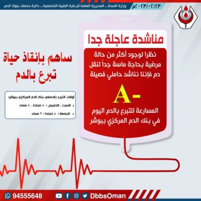 قالت دائرة خدمات بنوك الدم : نظرا لوجود أكثر من حالة مرضية بحاجة ماسة جداً لنقل الدم، فإننا نناشد حاملي فصيلة ( – A ) المسارعة للتبرع بالدم اليوم في بنك الدم المركزي ببوشر ساهم معنا في إنقاذ حياة وتبرع بالدم.