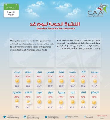 أعلنت هيئة الأرصاد الجوية عبر صفحتها الرسمية على موقع التواصل الاجتماعي تويتر عن حالة الطقس ليوم غد ،صحو بوجه عام على معظم المحافظات مع تدفق السحب العالية واحتمال تشكل السحب المنخفضة والضباب آخر الليل والصباح الباكر على أجزاء من محافظتي جنوب الشرقية والوسطى.