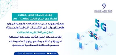 أعلنت هيئة تنظيم الإتصالات عبر حساب التواصل الاجتماعي تويتر عن إيقاف خدمات الجيل الثالث ابتداءً من الربع الثالث لعام 2024.