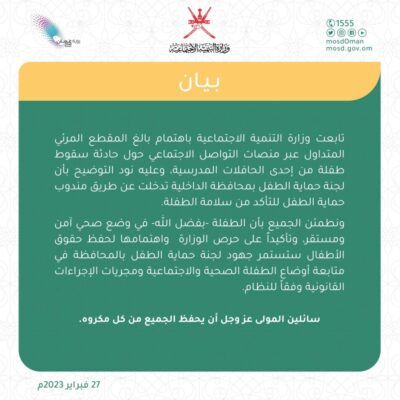 أصدرت وزارة التنمية الاجتماعية ‏بياناً حول المقطع المرئي المتداول بشأن تعرض طفلة لحادثة سقوط من إحدى الحافلات المدرسية.