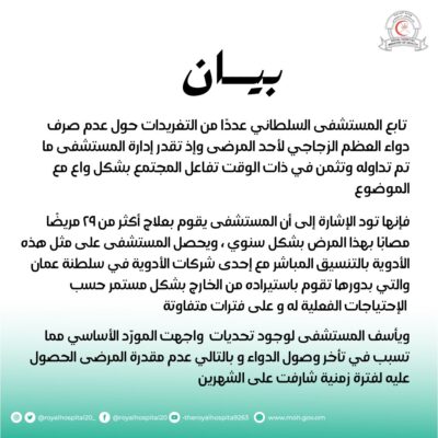 بعد تصدره موقع التواصل الاجتماعي .. المستشفى السلطاني توضح تأخر صرف دواء العظم الزجاجي لأحد المرضى