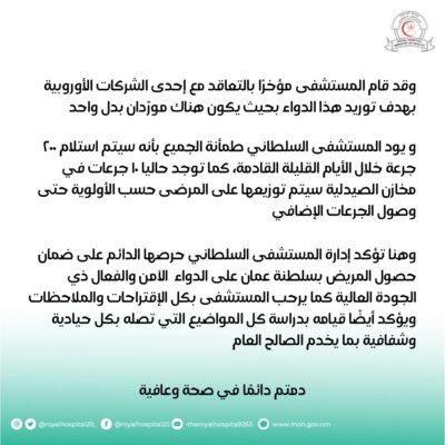 و تؤكد إدارة المستشفى حرصها الدائم على ضمان حصول المريض بسلطنة عمان على الدواء الآمن والفعال ذي الجودة العالية ،كما يرحب المستشفى بكل الاقتراحات والملاحظات ،ويؤكد أيضًا قيامه بدراسة كل المواضيع التي تصله بكل حيادية وشفافية بما يخدم الصالح العام ،دمتم دائمًا في صحة وعافية.
