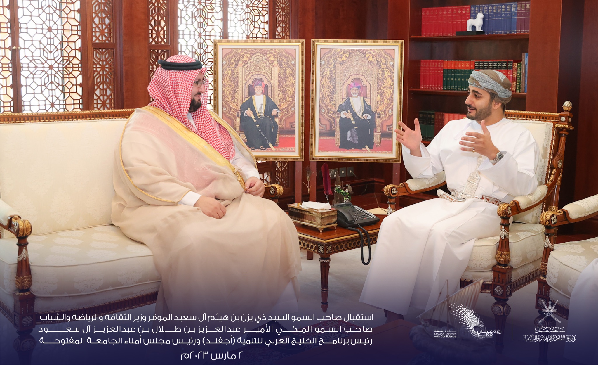 استقبل صاحب السمو السيد ذي يزن بن هيثم آل سعيد الموقر وزير الثقافة والرياضة والشباب صباح اليوم بديوان عام الوزارة صاحب السمو الملكي الأمير عبدالعزيز بن طلال بن عبدالعزيز آل سعود رئيس برنامج الخليج العربي للتنمية (أجفند) ورئيس مجلس أمناء الجامعة المفتوحة.
