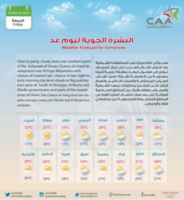 الطقس بوجه عام صحو إلى غائم جزئيا على المحافظات الشمالية مع احتمال تشكل السحب على جبال الحجر قد تؤدي إلى هطول أمطار متفرقة رعدية أحيانا مصحوبة برياح هابطة نشطة فرص تشكل السحب المنخفضة والضباب آخر الليل والصباح الباكر على أجزاء من محافظات جنوب الشرقية والوسطى وظفار وأجزاء من المناطق الساحلية المطلة على بحر عمان احتمال تصاعد الغبار في المناطق المكشوفة والصحراوية من محافظتي ظفار والوسطي.