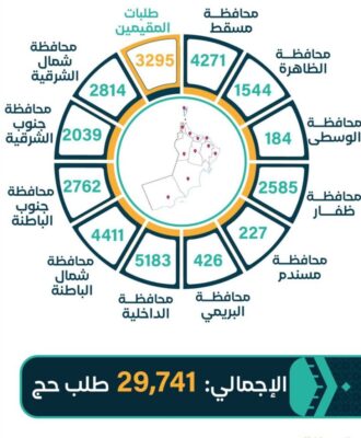 كما بلغ عدد مقدمي طلبات الحج حتى الساعة ٨.٣٠ مساء الخميس ٢ مارس أكثر من ٢٩٧٤١ طلباً، منهم حوالي ٣ آلاف طلب للمقيمين، وحلت محافظة الداخلية الأولى في عدد الطلبات المقدمة التي تجاوزت ٥ آلاف طلب .