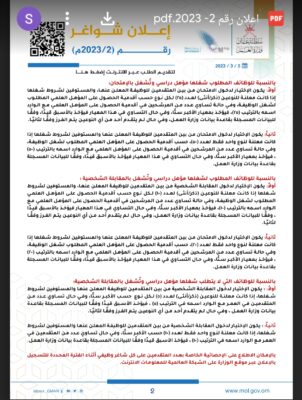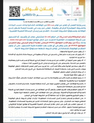 اعلنت وزارة العمل عن توفر (71) وظيفة شاغرة في القطاع الحكومي، وذلك حسب البيانات والشروط الموضحة أمام كل وظيفة، للاطلاع على الإعلان :