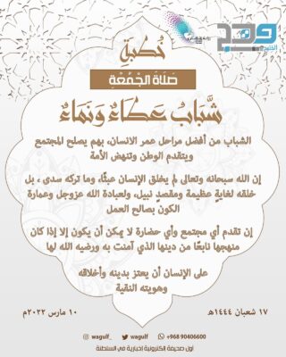 نشرت وزارة الأوقاف والشؤون الدينية خطبة الجمعة بعنوان “شباب عطاءٌ ونماءٌ” ، حيث تتناول عدة محاور أبرزها: