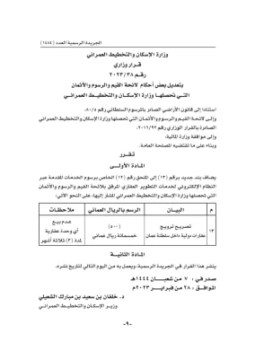 أصدرت وزارة الإسكان والتخطيط العمراني قرارا وزاريا رقم 38 لسنة 2023 بتعديل بعض أحكام لائحة القيم والرسوم والأثمان التي تحصلها وزارة الإسكان والتخطيط العمراني.