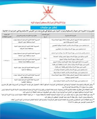 الثروة الزراعية والسمكية وموارد المياه تعلن عن طرح عدد من الفرص الاستثمارية في مزايدات