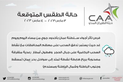 اعلنت الارصاد العمانية عن فرص تأثر أجواء سلطنة عمان بأخدود جوي من مساء اليوم ويوم غد حيث يستمر تدفق السحب على معظم المحافظات مع نشاط السحب الركامية على جبال الحجر وهطول أمطار رعدية متفرقة مصحوبة برياح هابطة نشطة تمتد إلى سواحل بحر عمان (مسقط وجنوب الباطنة وشمال الباطنة ومسندم).