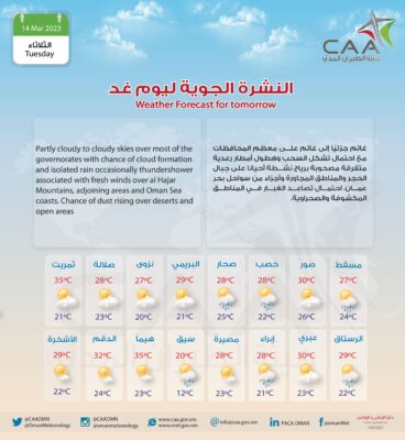 أعلنت هيئة الأرصاد الجوية عبر صفحتها الرسمية على موقع التواصل الاجتماعي تويتر عن حالة الطقس ليوم غد الثلاثاء ، الطقس غائم جزئيا إلى غائم على معظم المحافظات مع احتمال تشكل السحب وهطول أمطار رعدية متفرقة مصحوبة برياح نشطة أحيانا على جبال الحجر والمناطق المجاورة وأجزاء من سواحل بحر عمان، احتمال تصاعد الغبار في المناطق المكشوفة والصحراوية.