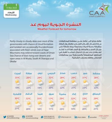 أعلنت هيئة الأرصاد الجوية عبر صفحتها الرسمية على موقع التواصل الاجتماعي تويتر عن حالة الطقس ليوم غد ، غائم جزئيا إلى غائم على معظم المحافظات مع احتمال تشكل السحب وهطول أمطار متفرقة رعدية أحيانا مصحوبة برياح نشطة على جبال الحجر والمناطق المجاورة قد تمتد لسواحل بحر عمان، احتمال تصاعد الغبار في المناطق المكشوفة والصحراوية من محافظات الوسطى وظفار وجنوب الشرقية.