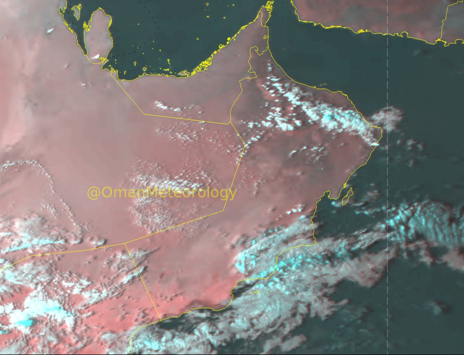 بالإضافة إلى غطاء سحابي من السحب المتوسطة والعالية على سواحل محافظتي الوسطى وظفار.