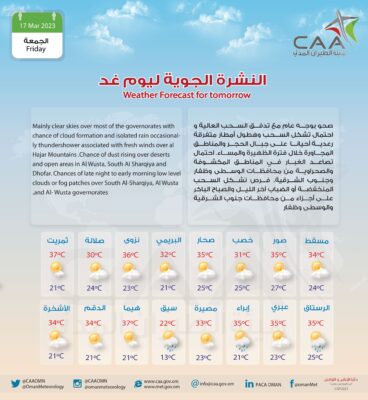 أعلنت هيئة الأرصاد الجوية عبر صفحتها الرسمية على موقع التواصل الاجتماعي تويتر عن حالة الطقس ليوم غد ، الطقس صحو بوجه عام مع تدفق السحب العالية و احتمال تشكل السحب وهطول أمطار متفرقة رعدية أحيانا على جبال الحجر والمناطق المجاورة خلال فترة الظهيرة والمساء. احتمال تصاعد الغبار في المناطق المكشوفة والصحراوية من محافظات الوسطى وظفار وجنوب الشرقية فرص تشكل السحب المنخفضة أو الضباب آخر الليل والصباح الباكر على أجزاء من محافظات جنوب الشرقية والوسطى وظفار.