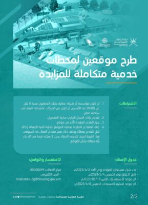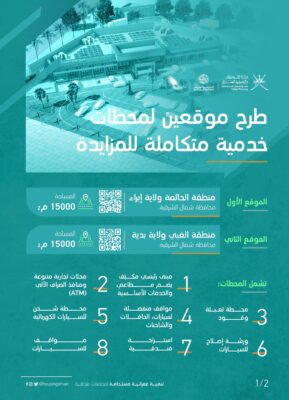 اعلنت وزارة الاسكان والتخطيط العمراني عن طرح موقعين لمحطات خدمية متكاملة للمزايدة في محافظة شمال الشرقية بولايتي إبراء وبدية وعلى مساحات 15 ألف م2.