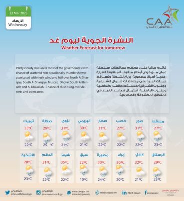 أعلنت هيئة الأرصاد الجوية عبر صفحتها الرسمية على موقع التواصل الاجتماعي تويتر عن حالة الطقس ليوم غد ، حيث الطقس غائم جزئيا على معظم محافظات سلطنة عمان مع فرص أمطار متفرقة متفاوتة الغزارة رعدية أحيانا مصحوبة برياح نشطة وتساقط حبات البرد على محافظات شمال الشرقية وجنوب الشرقية ومسقط وظفار والداخلية وجنوب الباطنة. احتمال تصاعد الغبار في المناطق المكشوفة والصحراوية.