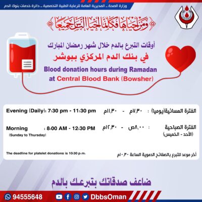 نشرت دائرة خدمات البنوك أوقات التبرع بالدم خلال شهر رمضان المبارك في  بنك الدم المركزي ببوشر كما هو موضح ادناه :
