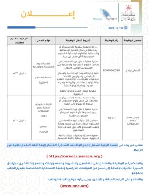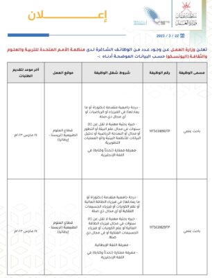 اعلنت وزارة العمل‬⁩ عن وجود عدد من الوظائف الشاغرة لدى منظمة الأمم المتحدة للتربية والعلوم والثقافة (اليونسكو) حسب البيانات الموضحة في الصور .