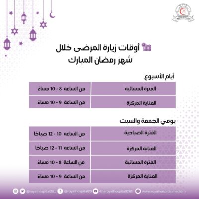 وهج الخليج - مسقط أعلنت المستشفى السلطاني عبر صفحتها الرسمية على موقع التواصل الاجتماعي تويتر مواعيد الزيارة في المستشفى أثناء الشهر الفضيل كما موضح بالجدول التالي: