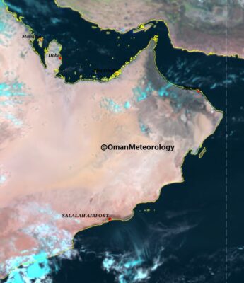 نشرت الارصاد العمانية صورة لاستمرار تدفق السحب العالية على الأجزاء الشمالية لسلطنة عمان، وان نشاط الرياح الشمالية الغربية النشطة على صحاري الوسطى والظاهرة والداخلية قد تؤدي إلى تصاعد الغبار والأتربة وتدني في مستوى الرؤية الأفقية في المناطق المكشوفة.