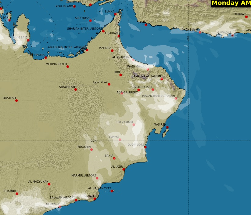 أعلنت هيئة الأرصاد الجوية العُمانية عن استمرار فرص تشكل السحب المنخفضة/ الضباب مع انخفاض في مستوى الرؤية الأفقية أحيانًا فترة آخر الليل والصباح الباكر ليوم غد الأثنين (27مارس2023) على أجزاء من محافظات جنوب الشرقية والوسطى وظفار وأجزاء من سواحل بحر عمان.