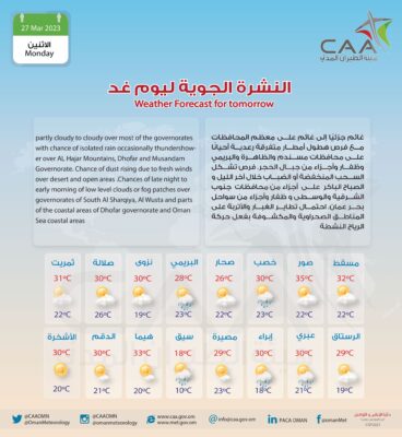 مع وجود فرص تشكل السحب المنخفضة أو الضباب خلال آخر الليل و الصباح الباكر على أجزاء من محافظات جنوب الشرقية والوسطى و ظفار وأجزاء من سواحل بحر عمان، احتمال تطاير الغبار والأتربة على المناطق الصحراوية والمكشوفة بفعل حركة الرياح النشطة.