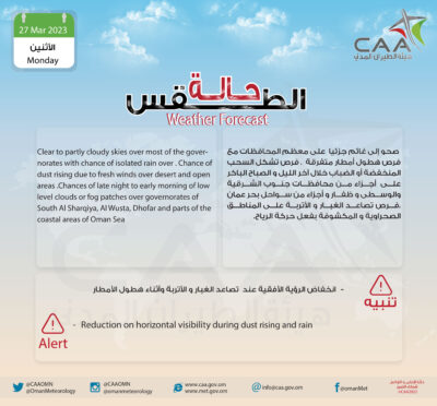 نشرت الارصاد العمانية ان الطقس صحو إلى غائم جزئيا على معظم المحافظات مع فرص هطول أمطار متفرقة، مع فرص لتشكل السحب المنخفضة أو الضباب خلال آخر الليل والصباح الباكر على أجزاء من محافظات جنوب الشرقية والوسطى وظفار وأجزاء من سواحل بحر عمان فرص تصاعد الغبار والأتربة على المناطق الصحراوية و المكشوفة بفعل حركة الرياح.