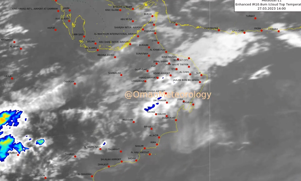 و تشهد حاليا أجزاء من محافظة مسندم و أجزاء من محافظة ظفار أمطار رعدية مصحوبة برياح هابطة نشطة أحيانا.