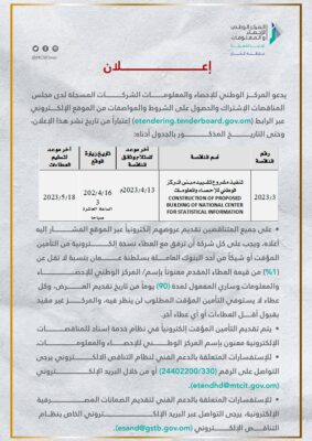 طرح مناقصة مشروع تشييد مبنى المركز الوطني للإحصاء والمعلومات