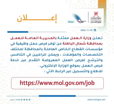 وهج الخليج - مسقط أعلنت وزارة العمل عن مجموعة من الوظائف الشاغرة في مؤسسات القطاع الخاص العاملة بمحافظة شمال الباطنة عبر خدمة فرص العمل بموقع الوزارة الإلكتروني.