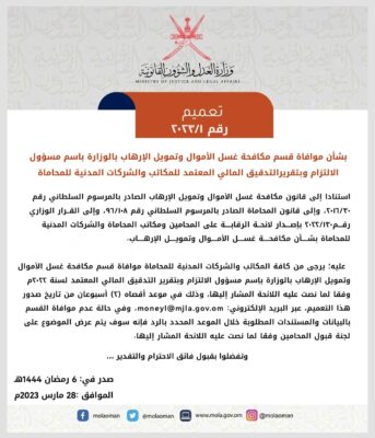 اصدرت وزارة العدل والشئون القانونية تعميماً بشأن موافاة قسم مكافحة غسل الأموال وتمويل الإرهاب بالوزارة باسم مسؤول الالتزام وبتقرير التدقيق المالي المعتمد للمكاتب والشركات المدنية للمحاماة.