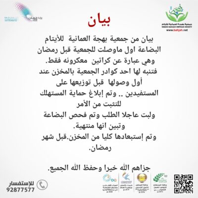 تمكنت هيئة حماية المستهلك بصلالة اليوم من ضبط 6000 سلعة تم التلاعب بتواريخ صلاحيتها بإعادة طباعة تواريخ جديدة عليها ، أصدرت جمعية بهجة العمانية للأيتام بياناً توضيحاً أوضحت فيه أن البضاعة اول ماوصلت للجمعية قبل رمضان وهي عبارة عن كراتين معكرونه فقط، فتنبه لها أحد كوادر الجمعية بالمخزن عند أول وصولها قبل توزيعها على المستفيدين .. وتم إبلاغ حماية المستهلك للتثبت من الأمر ولبت عاجلا الطلب وتم فحص البضاعة وتبين انها منتهية، وتم إستبعادها كليا من المخزن قبل شهر رمضان.