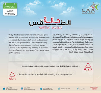 كما انه صحو بوجه عام على بقية المحافظات مع فرص تشكل السحب المنخفضة أو الضباب خلال آخر الليل والصباح الباكر على أجزاء من محافظتي الوسطى و ظفار فرص تصاعد الغبار والأتربة على المناطق الصحراوية و المكشوفة بفعل حركة الرياح.