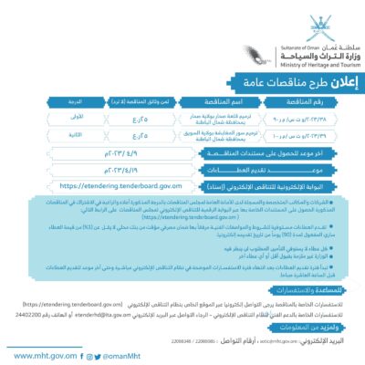 وهج الخليج - مسقط اعلنت وزارة التراث والسياحة عن طرح مناقصات عامة لترميم قلعة صحار بولاية صحار وترميم سور المغابشة بولاية السويق بمحافظة شمال الباطنة.
