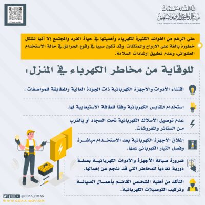 للوقاية من مخاطر الكهرباء في المنزل أصدرت هيئة الدفاع المدني والاسعاف عدة ارشادات يجب اتباعها: