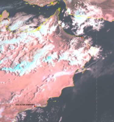 اوضحت الصورة الجوية تدفق السحب العالية والمتوسطة على معظم محافظات سلطنة عمان وتكثف السحب المنخفضة على أجزاء من محافظتي ظفار والوسطى مع فرص تشكل السحب الركامية وهطول أمطار متفرقة على جبال الحجر و أجزاء من محافظتي ظفار والوسطى خلال المساء.
