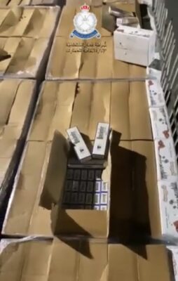 ضبطت جمارك منفذ الوجاجة محاولة تهريب أكثر من 20000 كرزَ سجائرَ و 899 كيلوجراماً من مشتقات التبغ ، كانت مخبأة بإحكام في مقطورة محملة بصناديق من التمور .