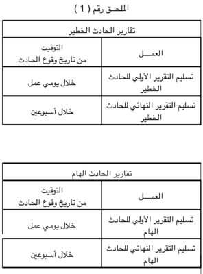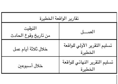 يلتزم المرخص له – فـي حالة وقوع حادث – بإبلاغ هيئة الدفاع المدني والإسعاف مباشرة بوقوعه، كما يجب عليه خلال (2) ساعتين على الأكثر من وقت وقوع الحادث إبلاغ كل من: