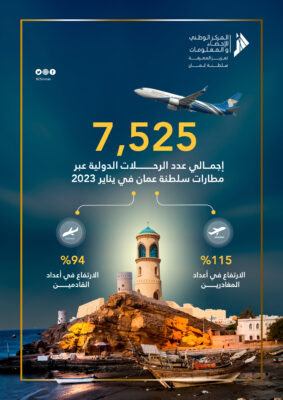 أعلن المركز الوطني للإحصاء او المعلومات إحصائية عبر موقعه الرسمي على موقع التواصل الاجتماعي تويتر عن حركة الطيران عبر مطارات سلطنة عمان في يناير 2023.