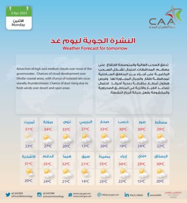 أعلنت هيئة الأرصاد الجوية العمانية عن حالة الطقس ليوم غد ، حيث تدفق السحب العالية والمتوسطة الارتفاع على معظم المحافظات احتمال تشكل السحب الركامية على أجزاء من المناطق الساحلية لمحافظة ظفار والجبال المجاورة لها وفرص هطول أمطار متفرقة رعدية أحيانا ، مع احتمال تصاعد الغبار والأتربة في المناطق الصحراوية والمكشوفة بفعل حركة الرياح النشطة.