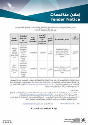 اعلنت وزارة النقل والاتصالات وتقنية المعلومات عن طرح مناقصات خدمات استشارية للإشراف على مشروع تصميم وتنفيذ وصلة طريق شناص بمحافظة شمال الباطنة؛ وتصميم طريق (سيح الخيرات/ الشصر)بمحافظة ظفار.