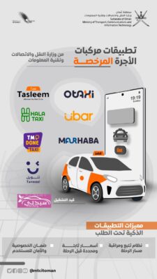 ضمن جهود وزارة النقل والاتصالات وتقنية المعلومات لتنظيم نشاط مركبات الأجرة في سلطنة عمان، أعلنت الوزارة أن عدد تطبيقات مركبات الأجرة المرخصة من قبل الوزارة بلغت 8 تطبيقات “تحت الطلب” سواء بنظام الحجز الفوري أو المسبق، وذلك بعد استيفائها متطلبات وبنود اللائحة التنظيمية لقانون النقل البري.