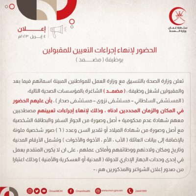 _اعلان الحضور لإنهاء إجراءات التعيين للمقبولين بوظيفة مضمد