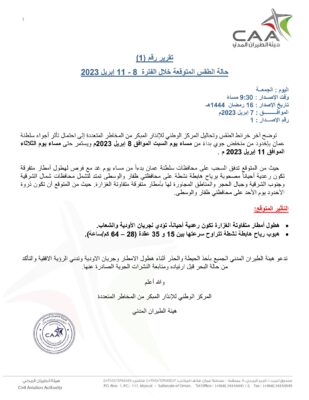 أصدرت هيئة الأرصاد الجوية عبر صفحتها الرسمية على موقع التواصل الاجتماعي تويتر التقرير الأول عن الحالة الجوية المتوقعة خلال الفترة من 8 إلى 11 أبريل 2023.