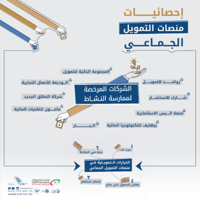 أشارت اخر إحصائيات الهيئة العامة لسوق المال والمتعلقة بمنصات التمويل الجماعي إلى ترخيص تسع شركات لممارسة نشاط التمويل الجماعي تمثلت في منصة إثيس الاستثمارية وشركة بيهايف للتكنولوجيا المالية بالإضافة إلى شركة النطاق الجديد وشركة إثبار وشركة الوديعة للأعمال التجارية وشركة روافد للتمويل إلى جانب المجموعة الذكية للتمويل ومأمون للتقنيات المالية، وشارك للاستثمار.