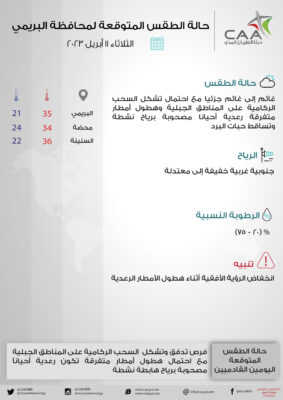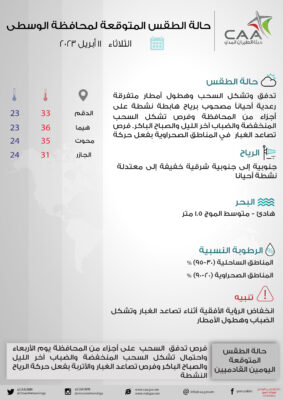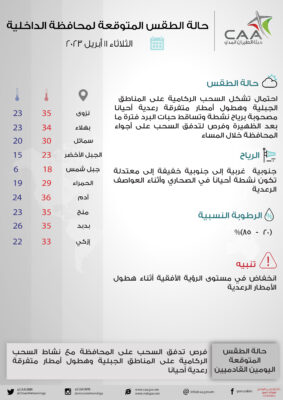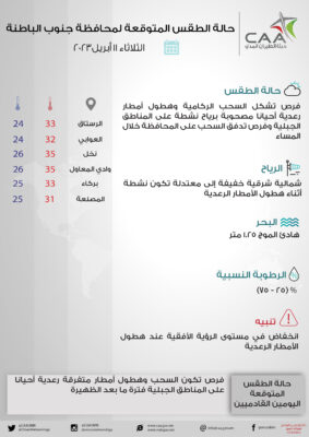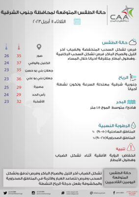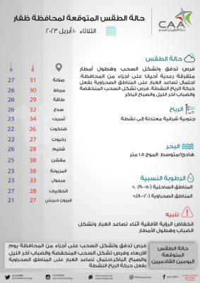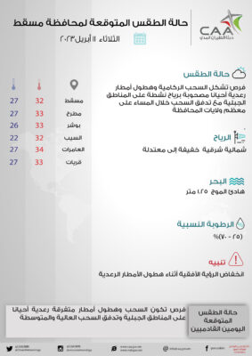 وهج الخليج - مسقط أعلنت هيئة الأرصاد الجوية عبر صفحتها الرسمية على موقع التواصل الاجتماعي تويتر عن حالة الطقس المتوقع ليوم غد فى محافظات سلطنة عُمان كما يلي :