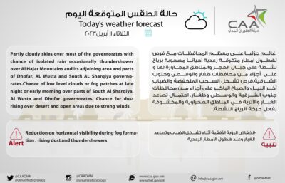 اعلنت الارصاد العمانية عن حالة الطقس اليوم حيث انه غائم جزئيا على معظم المحافظات مع فرص لهطول أمطار متفرقة رعدية أحيانا مصحوبة برياح نشطة على جبال الحجر والمناطق المجاورة لها و على أجزاء من محافظات ظفار والوسطى وجنوب الشرقية فرص تشكل السحب المنخفضة والضباب آخر الليل والصباح الباكر على أجزاء من محافظات جنوب الشرقية والوسطى وظفار. احتمال تصاعد الغبار والأتربة في المناطق الصحراوية والمكشوفة بفعل حركة الرياح النشطة.